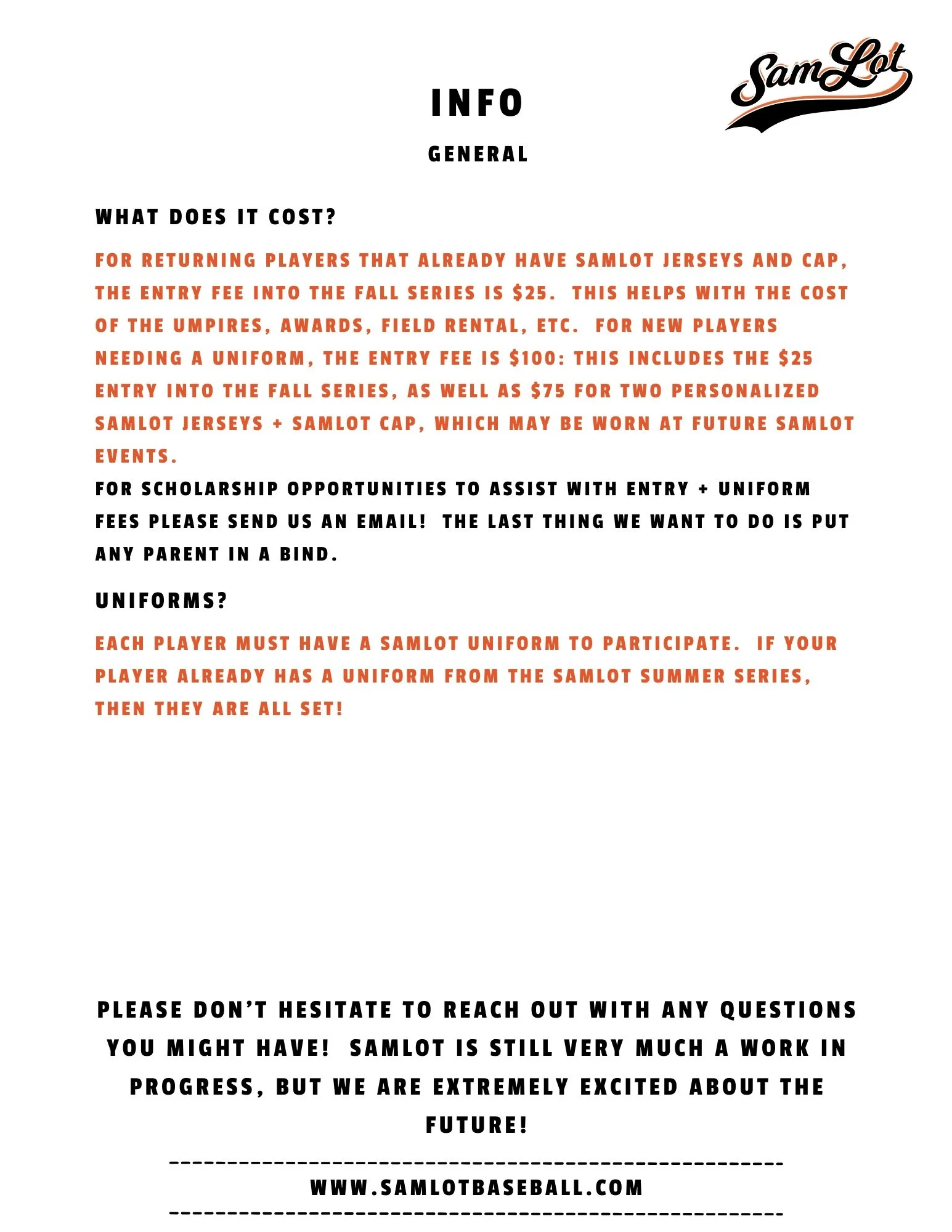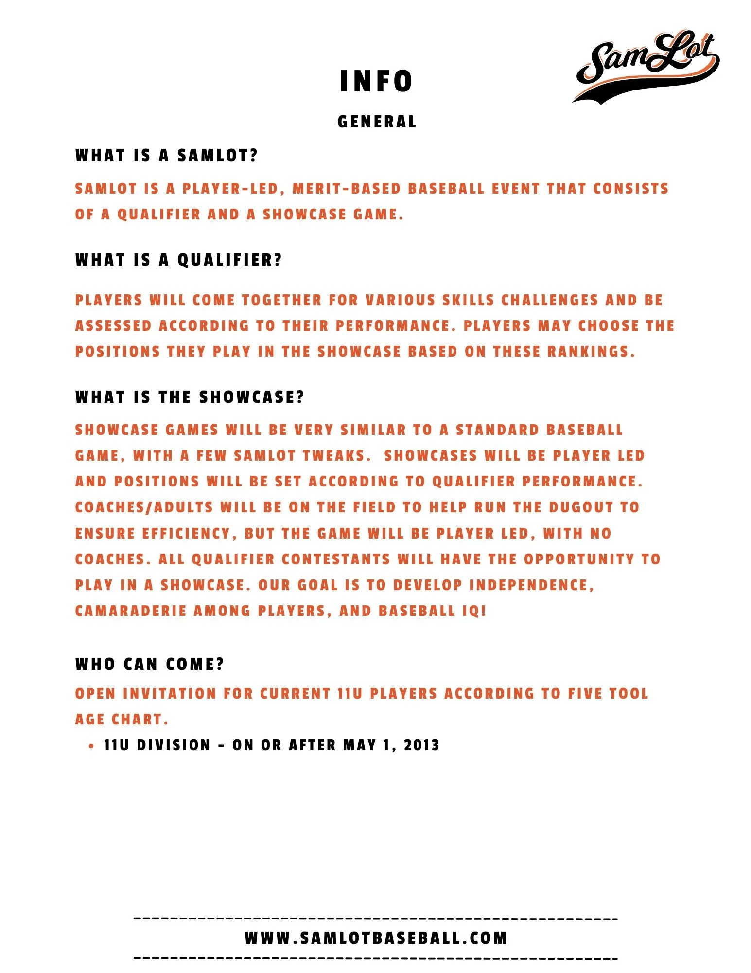 SamLot Fall Ball Series Monday, October 6, 2025 6:00 PM Friday, October 31, 2025 8:00 PM Josey Park 1230 Josey Street Huntsville, TX, 77340 United States (map) Google Calendar ICS 11U Fall Ball Registration