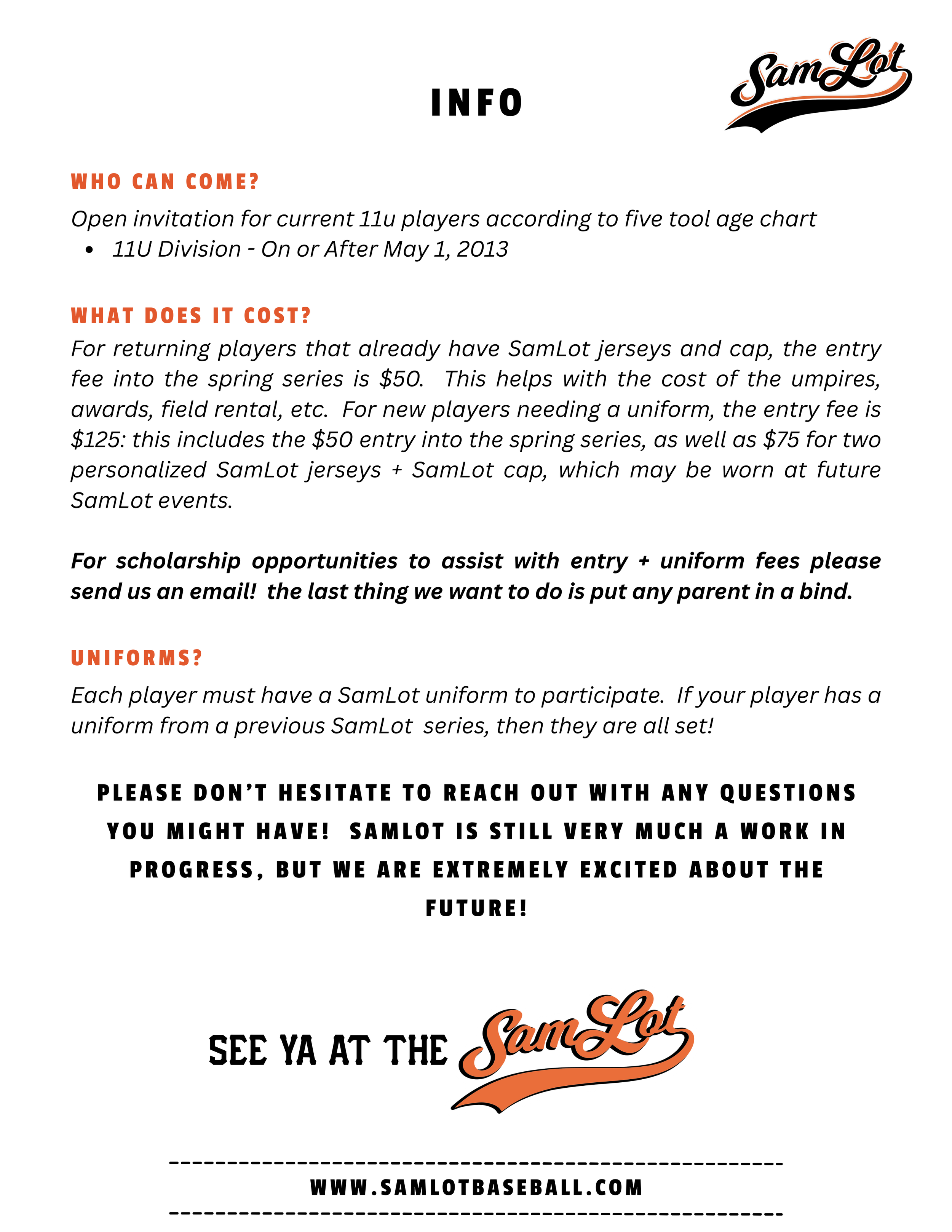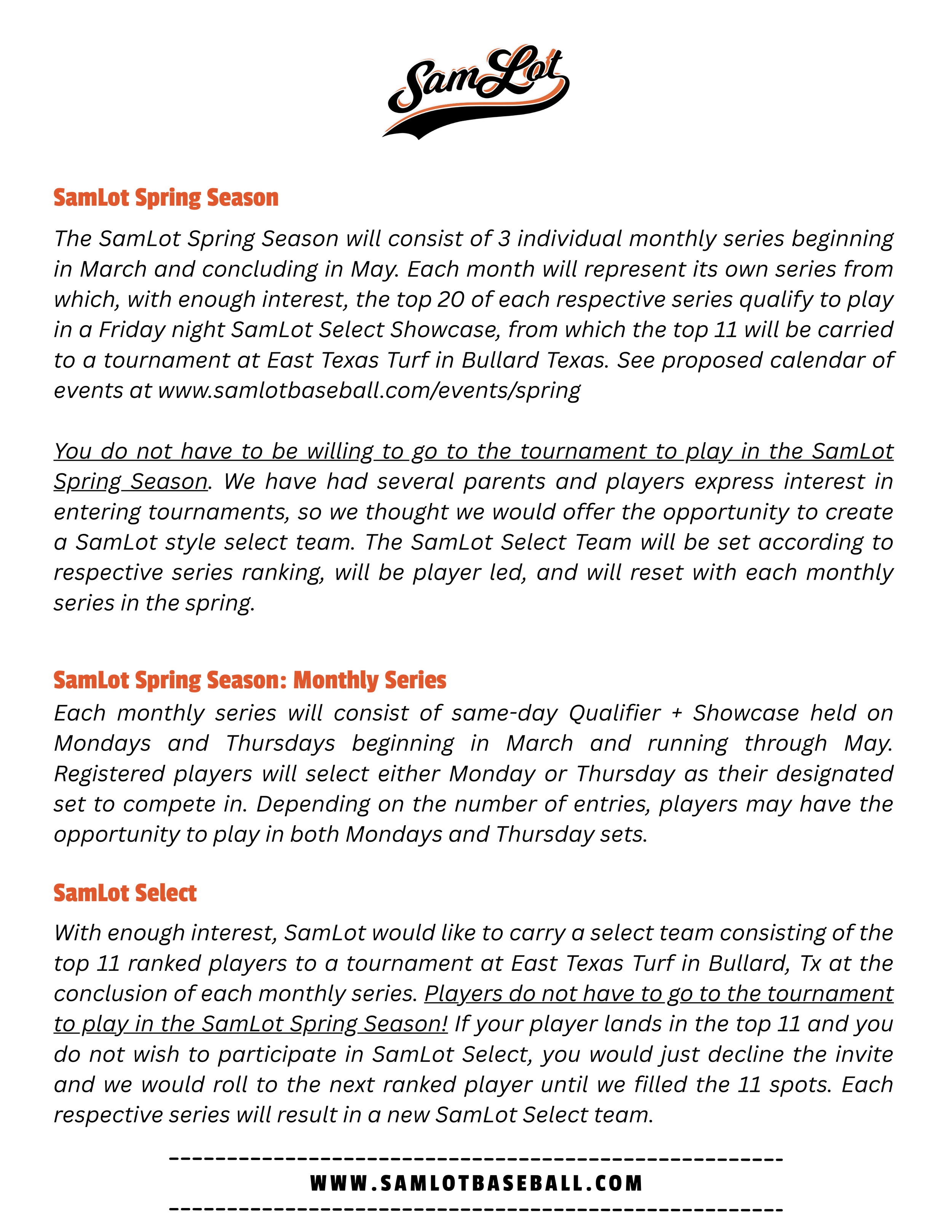 SamLot Spring Season Monday, March 2, 2026 6:00 PM Sunday, May 31, 2026 7:00 PM Josey Park 1230 Josey Street Huntsville, TX, 77340 United States (map) Google Calendar ICS REGISTRATION CLOSED Contact SamLot